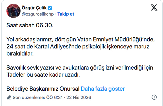 CHP İstanbul İl Başkanı Özgür Çelik, sosyal medya hesabından yaptığı açıklamada sürece tepki gösterdi. Çelik, gözaltı ve adli süreçte usulsüzlükler yaşandığını öne sürdü.