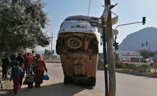 Çarpmanın etkisiyle sürücüsünün kontrolünden çıkan hafif ticari araç, yol kenarındaki telefon direğinin sabit durmasını sağlayan halatta asılı kaldı. Vatandaşların ihbarı üzerine olay yerine ambulans ve polis ekipleri sevk edildi.