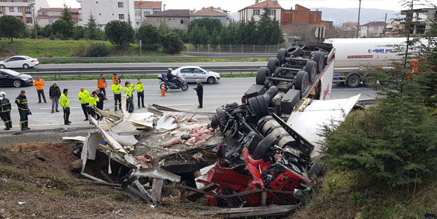 Yaklaşık 50 metre boyunca yolda sürüklenen tır, yolun sağındaki bariyerlere çarptıktan sonra su kanalına devrildi. Kaza nedeniyle tırın dorsesindeki etler yola saçıldı.